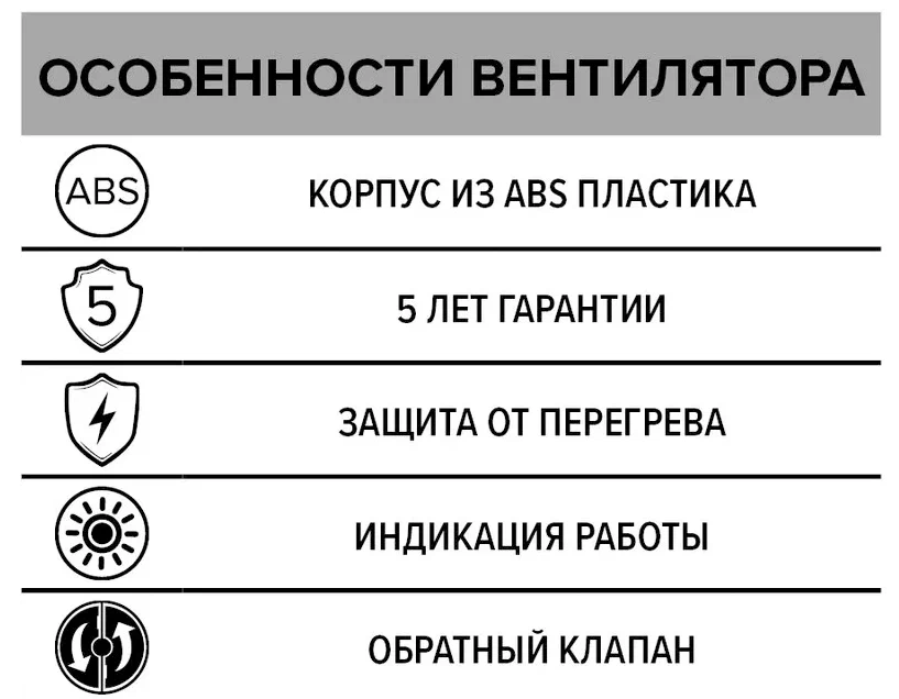 Вентилятор ERA 5С применяется для постоянной и периодической вентиляции санузлов, ванных комнат, кухонь и других бытовых помещений. Вентилятор отвечает самым строгим стандартам качества и безопасности. Двигатель на подшипниках скольжения гарантирует вытяжку влажного и загрязненного воздуха. А защита от перегрева автоматически выключит вентилятор при температуре двигателя +115°С - +125°С. Дополнительно оснащен обратным клапаном, который предотвращает проникновение неприятного запаха из шахты.